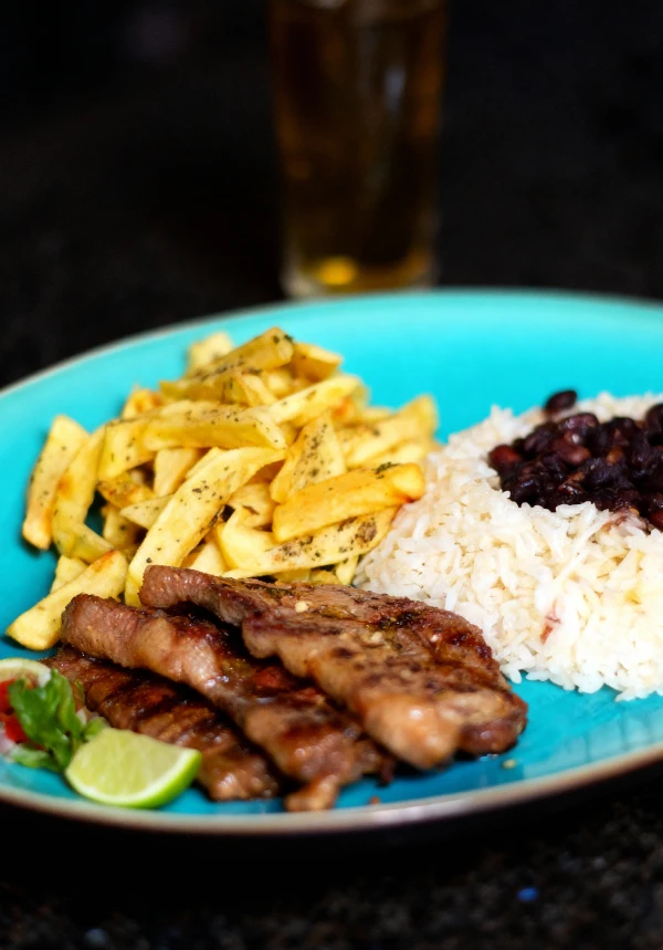 Com arroz, feijão preto, batata rena, farófia, couve mineira, ananás e banana.
